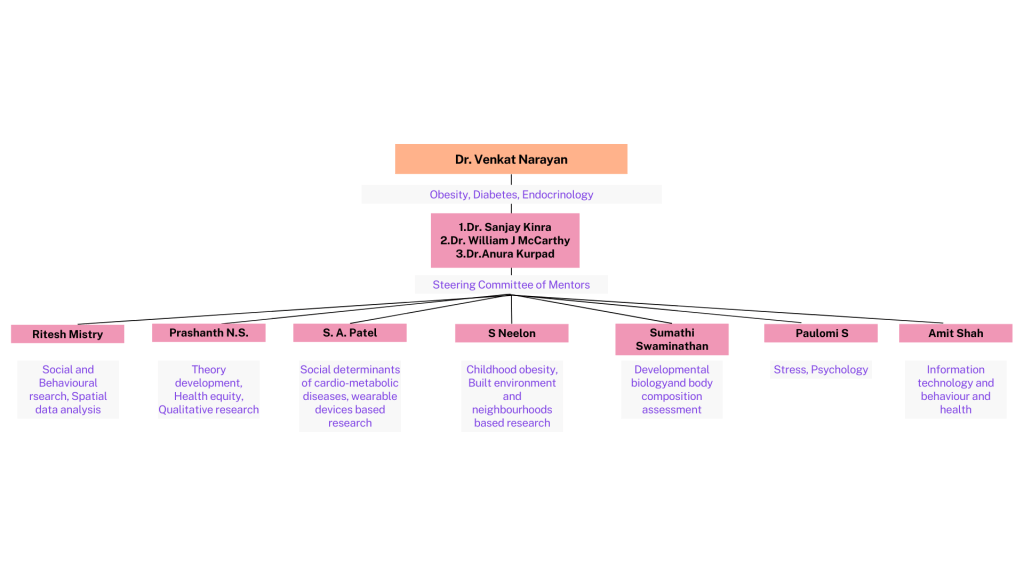 The steering committee of mentors is chaired by Professor Venkat Narayan, and includes Dr. Sanjay Kinra from London School of Hygiene and Tropical Medicine, Dr. William J. McCarthy from UCLA Fielding School of Public Health.
